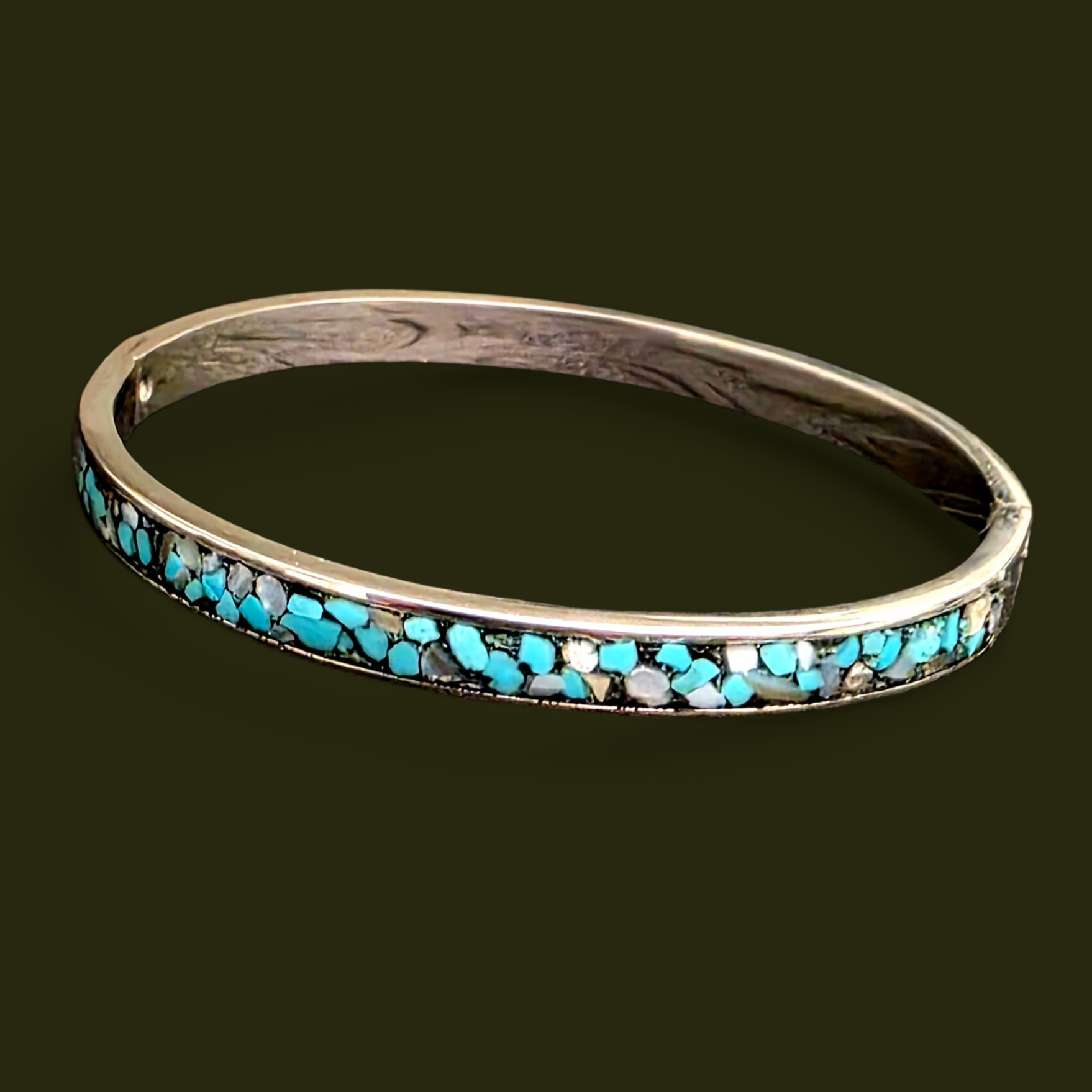 this is a hinged to open bracelet. The inlay is Morenci Turquoise and mother of pearl mix.